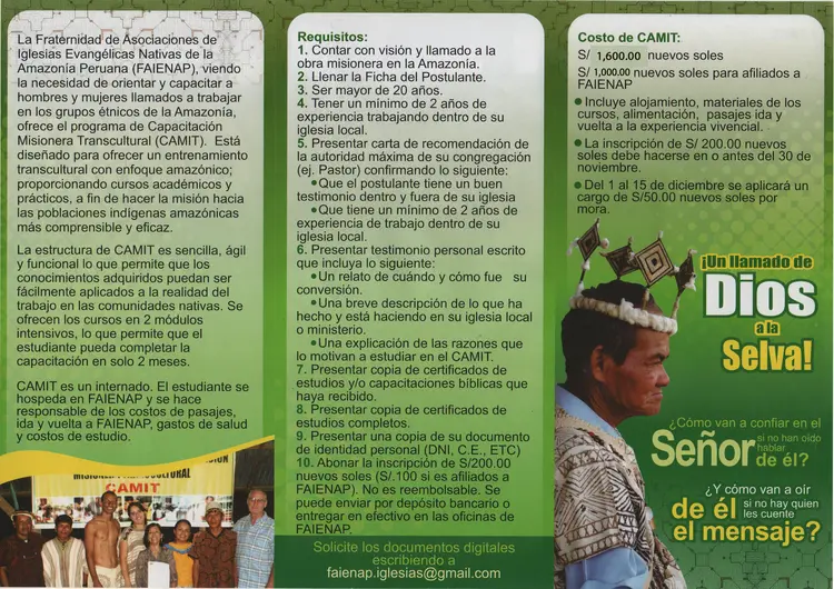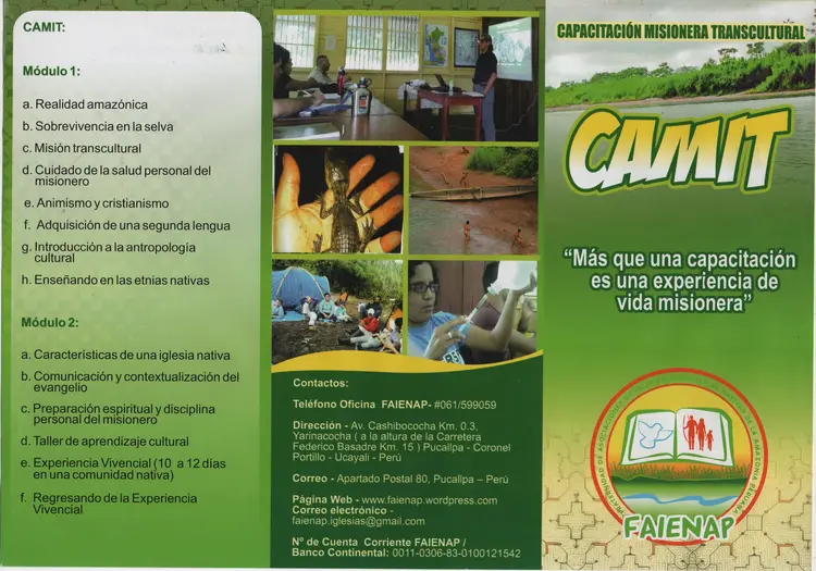 La Fraternidad de Asociaciones de Iglesias Evangélicas Nativas de la Amazonía Peruana (FAIENAP), viendo la necesidad de orientar y capacitar a hombres y mujeres llamados a trabajar en los grupos étnicos de la Amazonía, ofrece el programa de Capacitación Misionera Transcultural (CAMIT). Está diseñado para ofrecer un entrenamiento transcultural con enfoque amazónico; proporcionando cursos académicos y prácticos, a fin de hacer la misión hacia las poblaciones indígenas amazónicas más comprensible y eficaz. Además es una formación integral ya que le proporcionará al actual o futuro misionero conocimientos y herramientas que formarán su carácter y le serán de utilidad en su servicio a Dios. El programa se dará en la realidad de la selva y de las comunidades nativas.